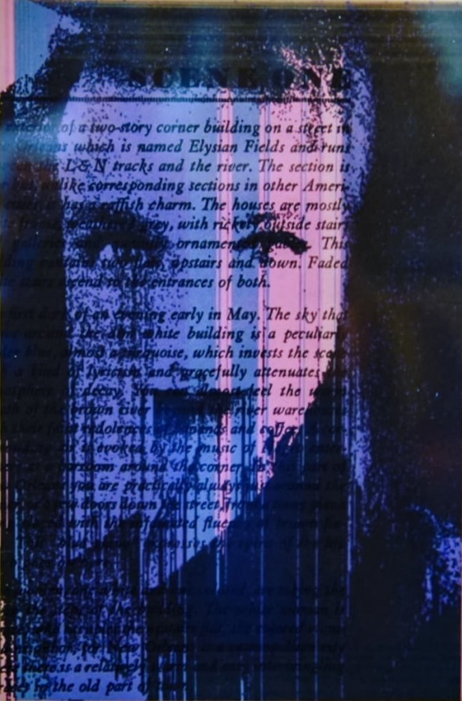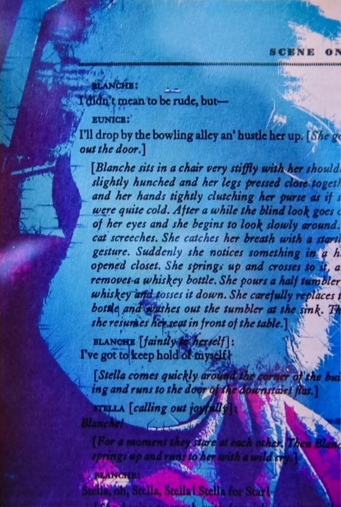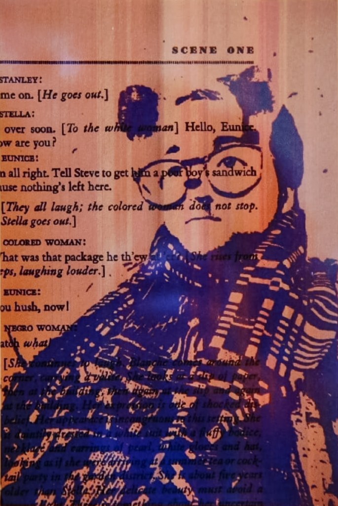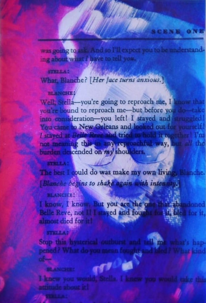 Following the creation of my Digital Decay series, I wanted to create tangible versions of those images that I most personally identified with that series. Seeing an opportunity to bridge the span between my photography and theatre studies, I created a series of self-portraits using pages from the classic Tennessee Williams play A Streetcar Named Desire.